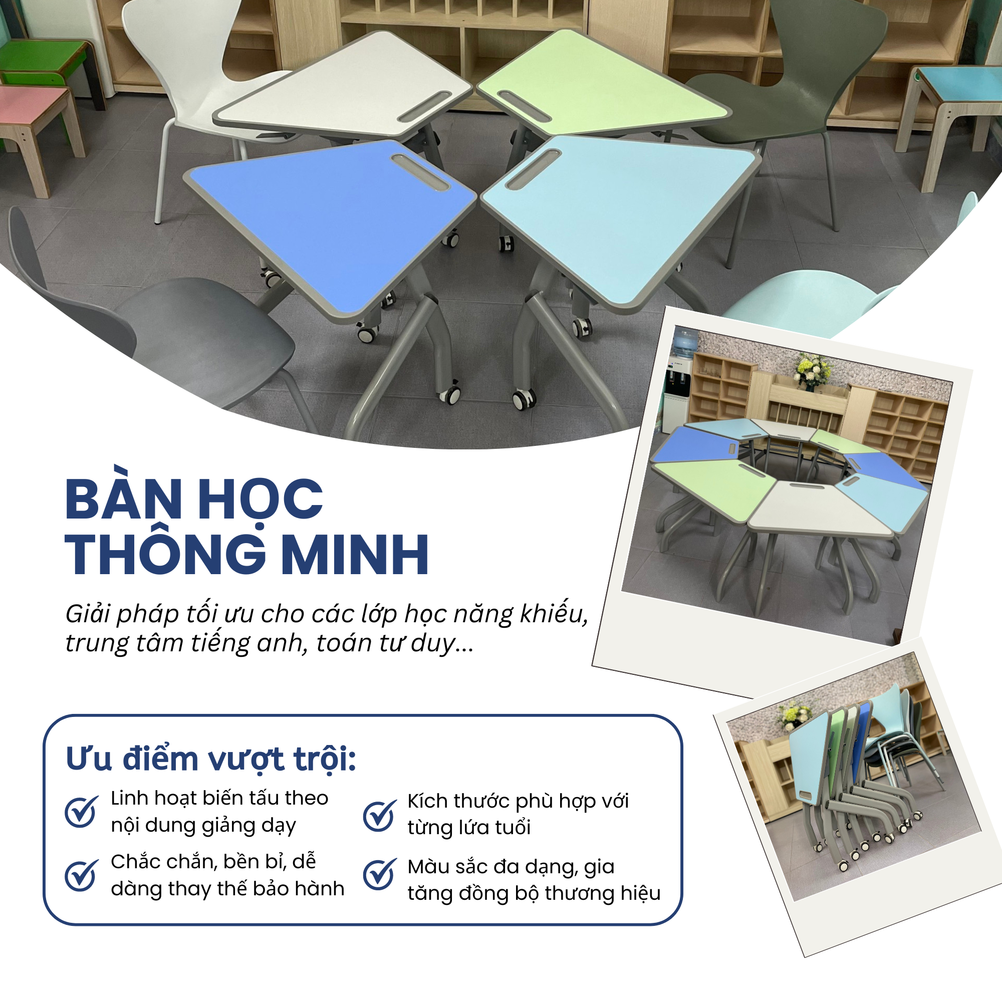 Ở Việt Nam, với đặc điểm dân số đông và tập trung đông ở các thành phố lớn, việc tối ưu được không gian và diện tích lớp học luôn được ngành giáo dục ưu tiên; nhận thấy cơ hội này, với hơn 10 năm hoạt động kinh doanh sản xuất trong ngành thiết bị giáo dục, chúng tôi đã nghiên cứu và cho ra các mẫu bàn ghế tiện ích. Tự hào là đơn vị tiên phong trong việc sản xuất và kinh doanh các mặt hàng bàn ghế thông minh, chúng tôi có những lợi thế lớn để có thể trở thành một đơn vị đi đầu dẫn dắt thị trường bàn ghế giáo dục trong tương lai gần.